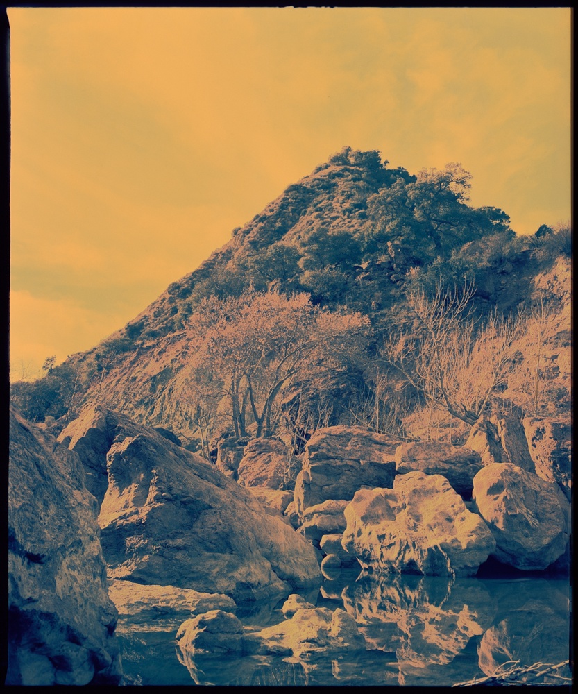 The sky above, softly hued with warm, muted tones, hints at the boundary between day and night—a subtle transition that lends the scene a sense of stillness and contemplative depth. Rendered with a sepia-inflected palette, the photograph balances natural beauty with an evocative nostalgia, inviting the viewer to explore the interplay between geological permanence and fleeting light. The resulting composition is both grounded and ethereal, a study in patience and the alchemy of analog process capturing a landscape that feels both timeless and immediate.